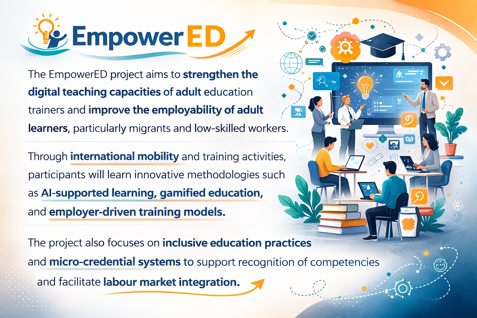 The EmpowerED project aims to strengthen the digital teaching capacities of adult education trainers and improve the employability of adult learners, particularly migrants and low-skilled workers. Through international mobility and training activities, participants will learn innovative methodologies such as AI-supported learning, gamified education, and employer-driven training models. The project also focuses on inclusive education practices and micro-credential systems to support recognition of competencies and facilitate labour market integration.